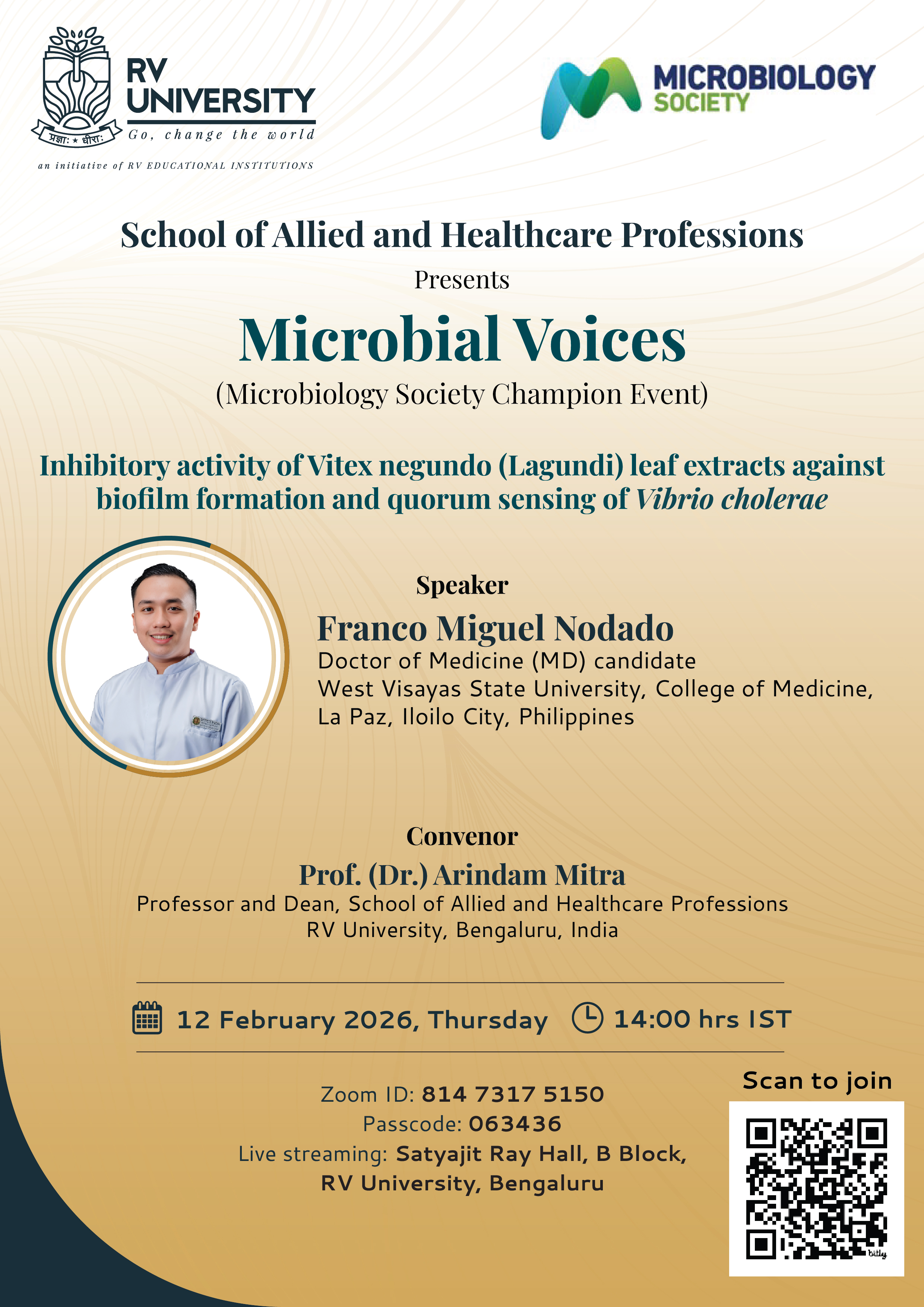 | 12 February 2026 | Microbial Voices: Inhibitory activity of Vitex negundo (Lagundi) leaf extracts against biofilm formation and quorum sensing of Vibrio cholerae Hosted by RV University, India |
